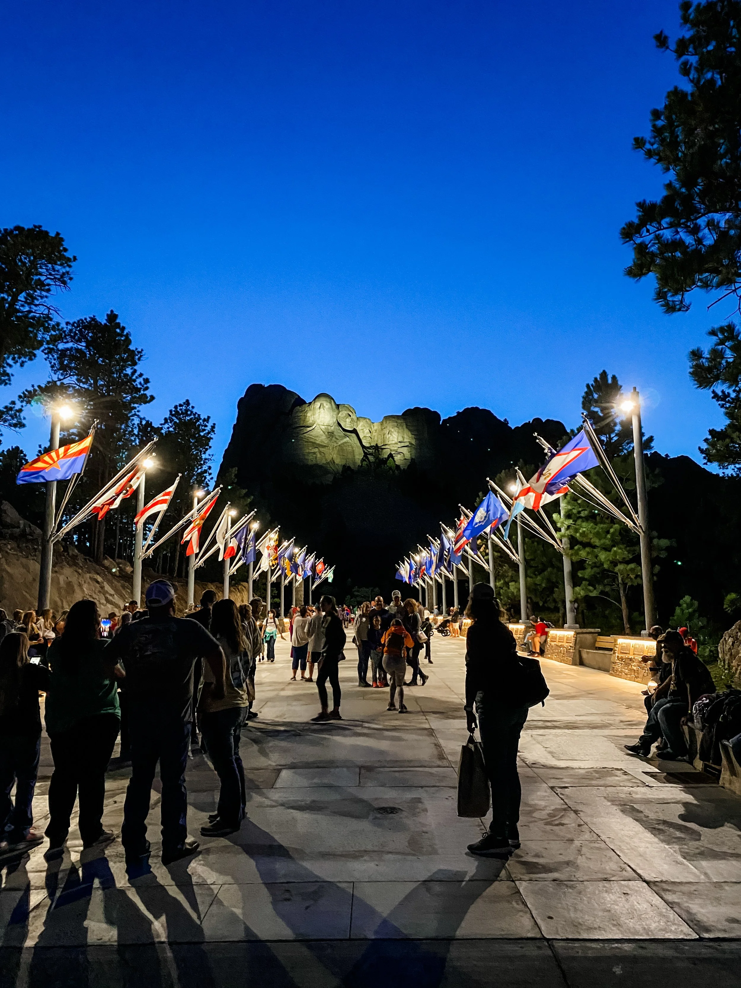 We crossed into South Dakota that evening and made our way to Mount Rushmore just after dark. I’m glad we went at night. It felt more dramatic somehow — the faces lit up against the sky instead of blending into it.